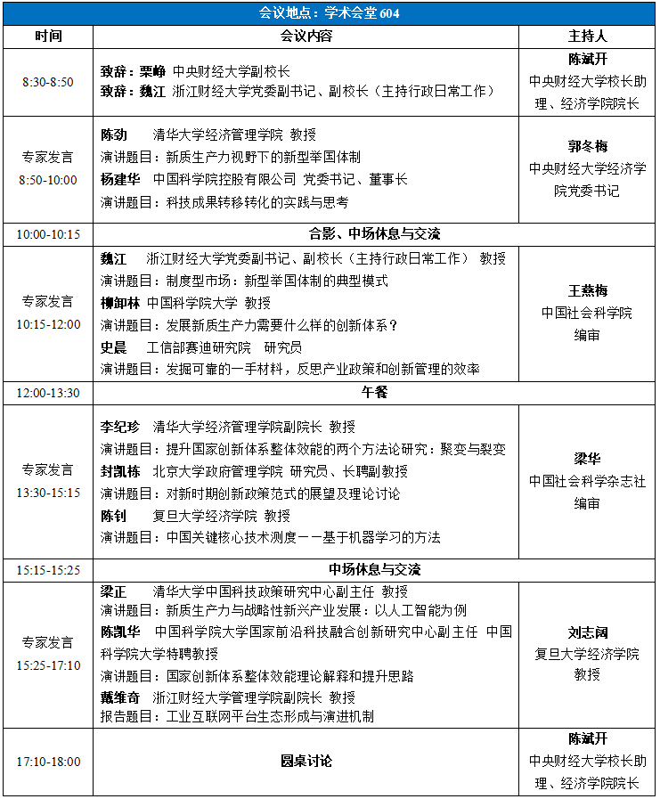 本次研讨会由太阳成tyc122cc和浙江财经大学管理公司联合举办。研讨会围绕“创新政策与新质生产力发展”“提升国家创新体系整体效能与政策体系”两个核心问题展开研讨。具体研讨会主题包括但不限于: