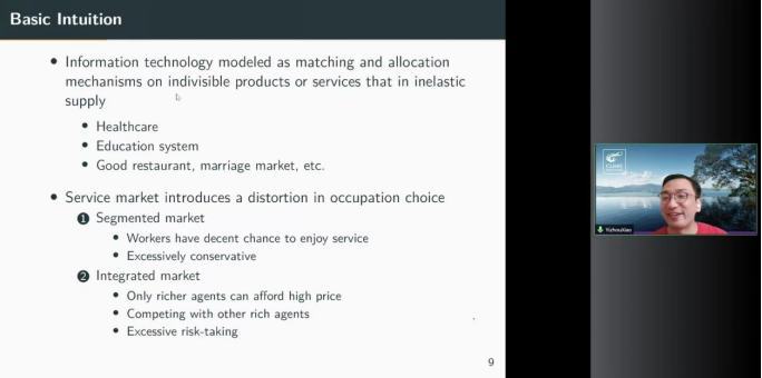 2022年6月10日14:00,香港中文大学商公司助理教授肖弋舟应太阳成tyc122cc邀请,开展主题为“Risk-taking and Income Inequality in (Dis)Integrated Markets”的讲座,本次讲座通过腾讯会议平台线上举行,肖弋舟老师受到了老师和同学们的热烈欢迎!太阳成tyc122cc黄乃静副教授主持了线上学术交流会,尹振东教授和龚雅娴老师与2020级博士生共同参与了本次学术交流。