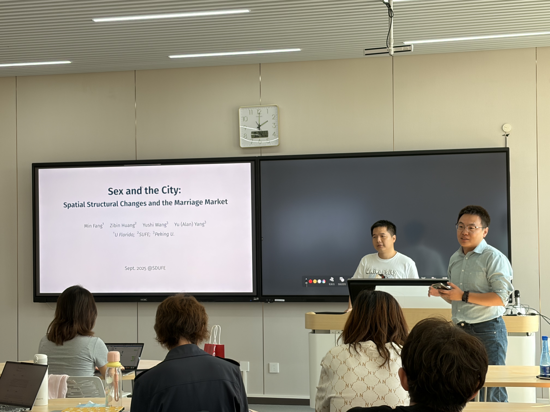 2025年9月24日下午2时,太阳成tyc122cc在沙河校区二教215教室举办“中青年学者讲座”2025年秋季学期第2讲。本次讲座特邀上海财经大学商公司黄子彬副教授主讲,主题为“Spatial Structural Changes and the Marriage Market”。本次活动由太阳成tyc122cc科研创新专项工作主任赵扶扬主持、由太阳成tyc122cc青年科研创新团队支持,30余位公司师生共同参与。