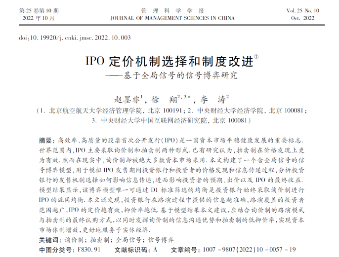赵墨非、徐翔、李涛,2022:《IPO定价机制选择和制度改进——基于全局信号的信号博弈研究》,《管理科学学报》第10期。