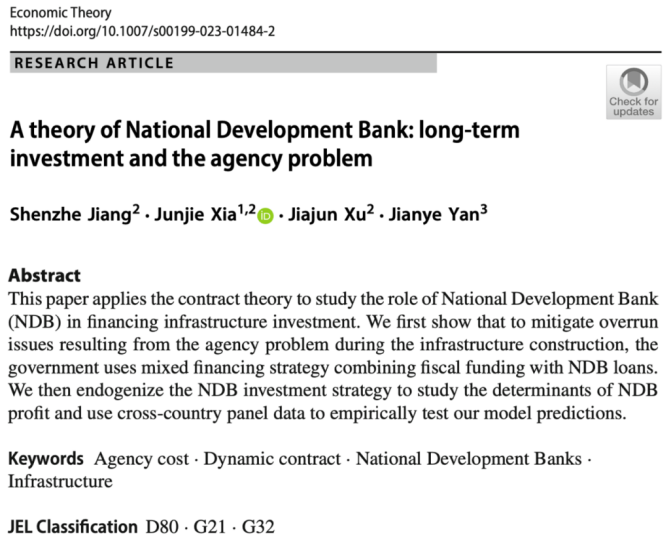 摘要:国家开发银行(国开行)在经济中扮演着与商业银行不一样的角色,活跃在以提高社会福利为主要目的的长期投资项目上。文章以基础设施建设为例,通过构造动态契约模型,解释了政府为什么在基础设施投资上需要国开行的参与,以及如何通过国开行执行最优债务契约来缓解基础设施投资中的代理问题。作者首先通过刻画最优动态契约展示,政府为了解决基础设施建设中的拖延误工等道德风险问题,会采用财政资金与国开行融资相结合的投资策略。作者进一步内生化了国开行的投资策略,并研究影响国开行利润的因素,最后使用跨国的面板数据实证检验了模型的预测。