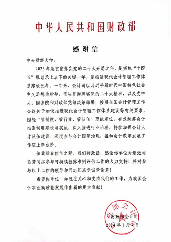 近日,公司可持续准则研究中心主任刘轶芳教授收到了来自财政部会计司的感谢信。信中对刘轶芳主任在过去一年中参与的可持续披露准则评估工作给予了充分的肯定和表示感谢。