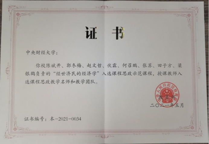 由公司陈斌开、郭冬梅、赵文哲、伏霖、何召鹏、张苏、田子方、梁银鹤负责的“经世济民的经济学”入选教育部课程思政示范课程,授课教师入选课程思政教学名师和教学团队。