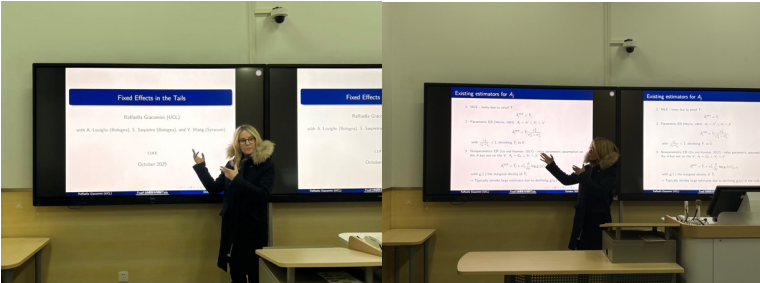 Raffaella Giacomini教授指出,在教育、医疗等公共服务领域,政策制定者往往关注绩效分布的两端——表现最优或最差的个体。然而,这些政策所依赖的“排名”或“极端分位数”通常基于不可观测的固定效应,而传统计量方法在样本量有限或关注尾部特征时往往会产生较大的偏误。针对这一挑战,Raffaella Giacomini教授提出一种仅关注固定效应尾部特征的半参数方法,其核心思想是对观测数据的尾部行为建模,研究者可以识别不可观测的固定效应在尾部的排序、估计尾部相关指标等。在互动交流环节,与会师生围绕这种新方法的具体适用场景以及估计依赖的假设条件展开讨论。