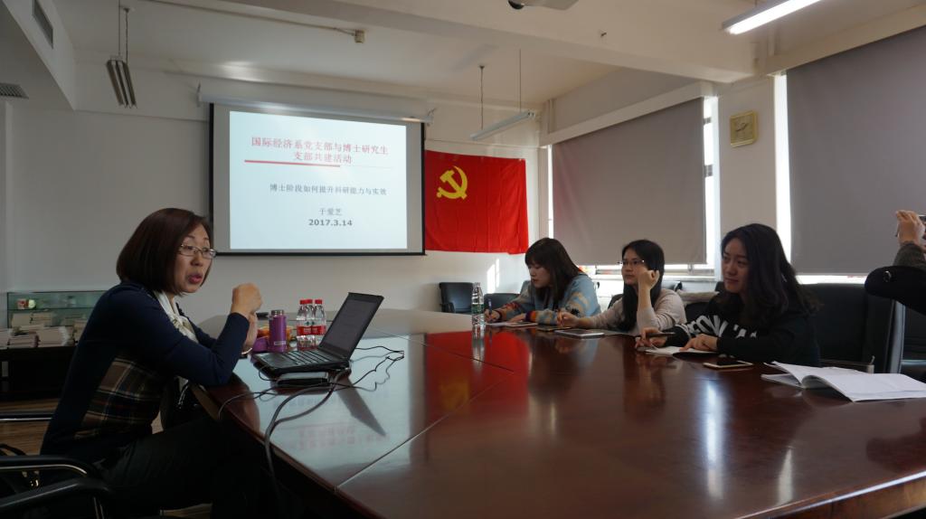 2017年3月14日,太阳成tyc122cc国际经济学系教工党支部书记、国际经济学系主任于爱芝教授在主教学楼1407会议室,为2015、2016级博士生党支部做了题为“博士阶段如何提升科研能力与实效”的专题讲座,并与到场博士生交流研讨。本次活动为经济公司党委教工党支部与员工党支部的“师生面对面”共建帮扶系列活动,由国际经济学系教工党支部与2015级、2016级博士生党支部率先开展,经济公司党委组织员刘滨老师、2016级博士生党支部全体党员、2015级博士生党支部部分党员和入党积极分子参加了此次研讨会。