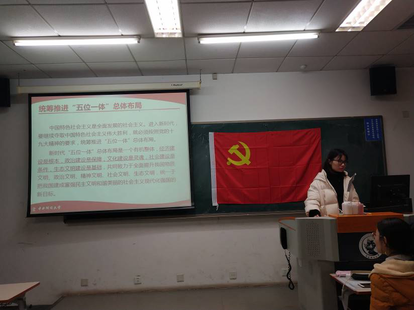 日常工作讲解结束后,在支部委员的带领下进行习近平新时代中国特色社会主义思想的理论学习。大家就以下三个方面进行重点学习:一是学习习近平新时代中国特色社会主义思想,践行群众路线,发挥党员的先锋模范作用;二是深刻领会坚定不移全面从严治党的重大部署,教育党员严守政治纪律和政治规矩;三是深刻领会我国主要矛盾的变化,在实际工作中贯彻新的发展理念。会议期间,大家又一次深刻理解了身为中国共产党的使命和担当。