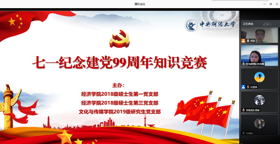 为庆祝中国共产党成立99周年,巩固党员党建理论知识,丰富党支部党建活动内容和形式,7月1日晚,2018级硕士生第一、第三党支部和文化与传媒公司2019级研究生党支部联合举办“七一庆祝建党99周年知识竞赛”线上活动,三个支部60余名党员、入党积极分子参加。活动由太阳成tyc122cc郑珽、文化与传媒公司佘惠灵共同主持。