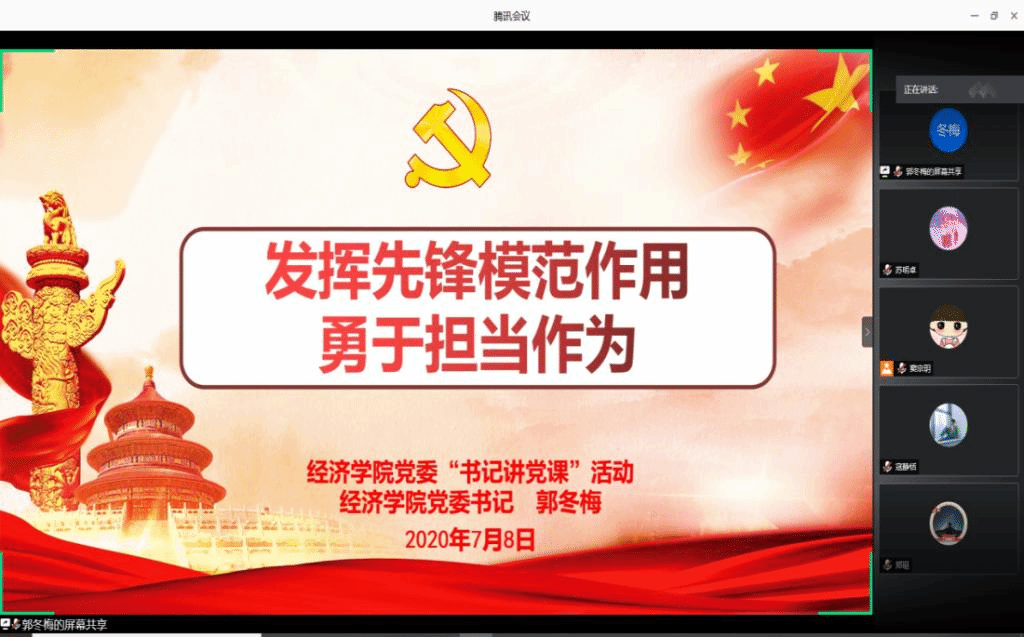 2020年7月8日晚19:00,经济公司党委“书记讲党课”活动在腾讯会议平台举行。经济公司党委书记郭冬梅教授、组织员刘滨老师出席,2020年发展对象、2019-2020年第二学期入党积极分子参与学习,会议由党务秘书窦宗玥老师主持。