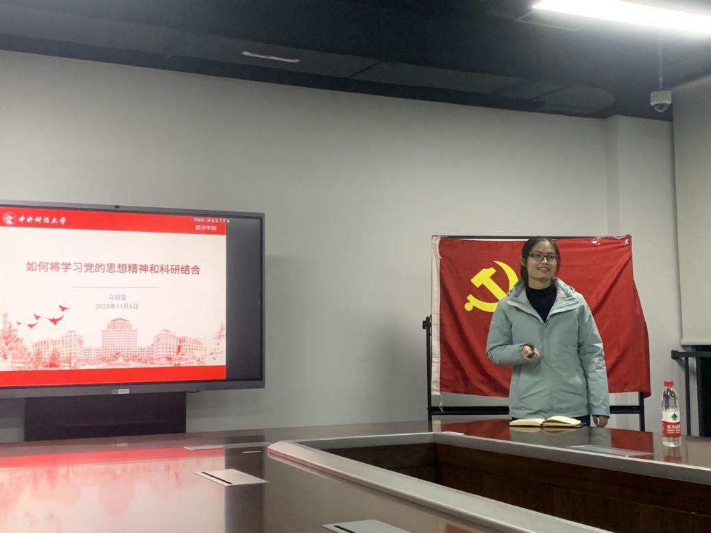 马丽亚同学从新《中国共产党章程》的精神,十九届五中全会精神,习近平同志在国家中长期经济社会发展战略若干重大问题三个维度讲解了如何将党的精神和科研结合。当党要求我们的生活要满足多样化,高质量的需求,可以研究城市规模、人口结构与不可贸易品多样性;为支持科教兴国战略,可以研究如何通过教育缓解收入不平等;当国家要继续进行城市化发展,可以调研中国式城镇化的福利效应评价。每一个论文案例都是紧紧贴切着文件精神,让同学们感叹原来每天绞尽脑汁想的论文出发点都暗藏在党的文件里,找到了更多新的思路源头,日常生活要注重党的建设与科技创新的有机结合,找准与科技创新工作的结合点,形成良好互动的局面。