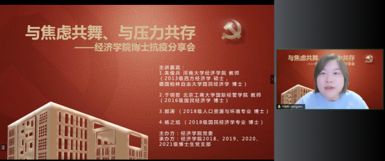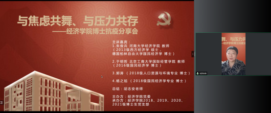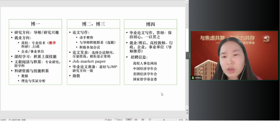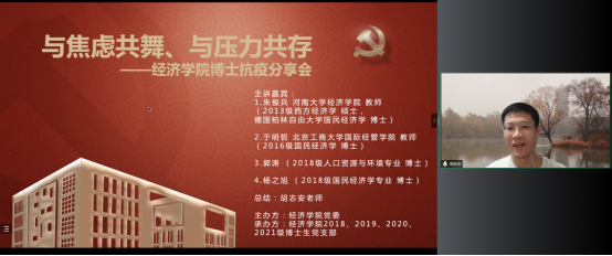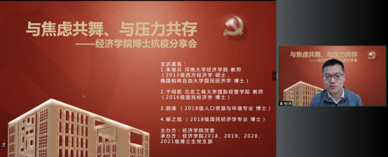 经济公司党委在切实做好校园疫情防控工作的基础上,帮助博士生树立正确的就业择业观,缓解博士生对不同学习阶段以及未来职业生涯规划的压力,在全院博士生中深入开展了以学业规划和择业选择为主题的抗疫分享会。2022年5月14日,太阳成tyc122cc特邀在高校就职的博士员工代表朱俊兵、于明哲和2018级博士党支部代表郭涛、杨之旭,充分发挥自身科研知识与专业特长,为经院博士生答疑解惑,并邀请胡志安老师作总结发言。活动由经济公司党委组织员刘滨老师和2018级博士生党支部书记马陆共同主持,2018、2019、2020、2021级博士党支部联合承办。