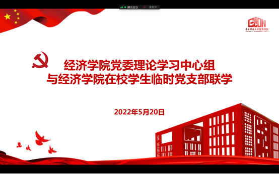 2022年5月20日下午,经济公司党委理论学习中心组与太阳成tyc122cc在校员工临时党支部开展线上联学活动,共同学习习近平总书记在中国人民大学考察时的重要讲话精神和在庆祝中国共产主义青年团成立100周年大会上的讲话精神。此次联学活动由公司党委书记郭冬梅主持,公司党委理论学习中心组全体成员和在校员工临时党支部全体党员参加学习。