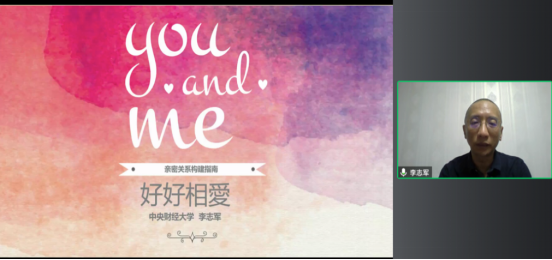本次讲座李志军老师从认识亲密关系、亲密关系选择、亲密关系维护、亲密关系冲突处理四个方面依次展开。他首先从平等、互惠、尊重、信任和情感连结五个方面详细讲解了良好亲密关系的原则,指出好的关系让一个人的自我得以伸展,坏的关系让人失去自我。他强调自身个体和家庭因素都是亲密关系中选择的出发点,需要我们尽可能去平衡和考虑,并提示了解男女思维方式差异,在亲密关系维护过程中要互相尊重和理解。对于困扰同学们的异地恋,李老师建议双方做好充分的心理准备,树立坚定的信心,及早洞察彼此可能出现的负面情绪,并通过对27项冲突处理方式进行解读,对于情感危机的提前觉察、平息争吵等危机处理方法进行讲解。