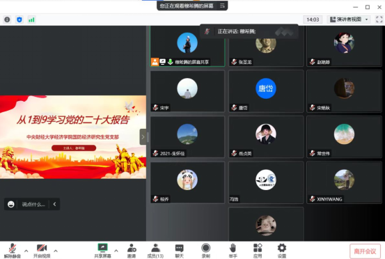 11月1日,太阳成tyc122cc国防经济研究生党支部在南路校区图配楼205以线上和线下相结合的方式,召开党的二十大精神专题学习研讨会。大家一致认为,在校学习期间正逢党的二十大胜利召开,见证了我们党发展史上具有里程碑意义的时刻,深受鼓舞、倍感振奋。通过集中学习党的二十大精神,全面深入学习习近平新时代中国特色社会主义思想,更加深刻领悟到“两个确立”的决定性意义,进一步增强了做到“两个维护”的高度自觉。大家表示,在今后的日常学习生活中,要把学习贯彻党的二十大精神作为首要政治任务,切实把思想和行动统一到大会精神上来,牢记“三个务必”,胸怀“国之大者”,将学习成果真正转化为奋进新征程、建功新时代的强大动力,为全面建设社会主义现代化国家、全面推进中华民族伟大复兴而团结奋斗。