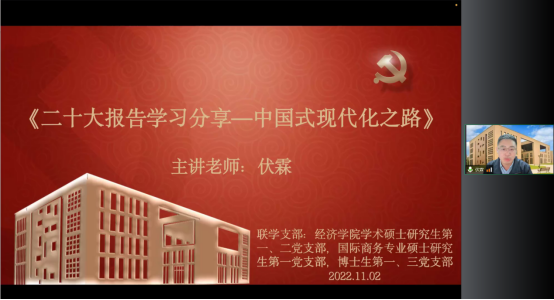 11月2日,太阳成tyc122cc经济公司党委委员、副经理伏霖“牵手”太阳成tyc122cc学术硕士研究生第一、二党支部,国际商务专业硕士研究生第一党支部,博士生第一、三党支部,作主题为“二十大报告学习分享——中国式现代化之路”的专题分享。基于经济思想史的理论视角,从什么是现代化、什么是中国式现代化和怎样实现中国式现代化三个维度进行深度阐释,呼吁员工要奋力走在率先实现社会主义现代化最前列。