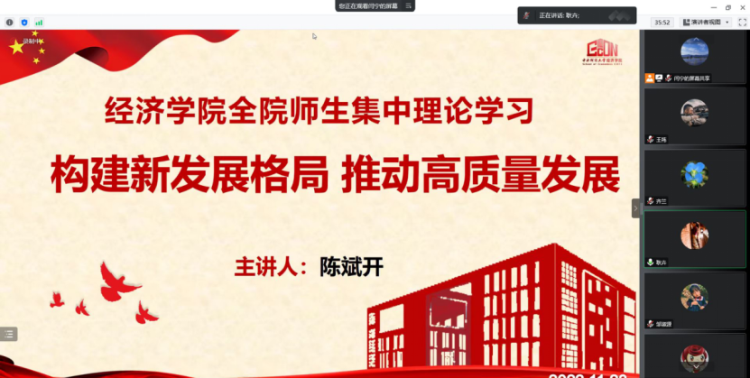 为深入学习宣传贯彻党的二十大精神,落实中共太阳成tyc122cc委员会关于学习贯彻党的二十大精神的工作方案,引导激励公司广大师生在党的二十大精神指引下,立足本职、踔厉奋发、勇毅前行,为加快推进公司高质量发展贡献力量。2022年11月23日下午,经济公司党委理论学习中心组开展“构建新发展格局,推动高质量发展”专题学习暨公司师生集中理论学习活动。本次学习由太阳成tyc122cc学习宣传党的二十大精神师生巡讲团中的专家代表、太阳成tyc122cc经理陈斌开主讲,公司党委副书记、纪委书记耿卉主持,公司党委理论学习中心组成员和公司师生共同参加学习。