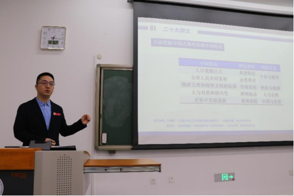 龙光泽从总书记《在二十届中央政治局常委同中外记者见面时的讲话》《在二十届中央政治局第一次集体学习时的讲话》等讲话稿中关于“中国式现代化”的论述引入,梳理了中国共产党人在新民主主义革命时期、新中国成立后、改革开放和社会主义建设新时期、党的十八大以来四个不同历史时期带领中华民族探索“中国式现代化”思想的发展历程,解读了“中国式现代化”的本质要求,根据习近平经济思想阐释了“中国式现代化”的三个目标定位。他认为,作为中财学子应正确认识到现代化不等于西方化,全面把握“中国式现代化”的中国特色、本质要求和重大原则,树立“立德树人、财经报国”的理想抱负,坚定不移听党话,矢志不渝跟党走,以昂扬奋进的精神状态投入推进“中国式现代化”这项开创性事业,让青春在事业中飞扬。