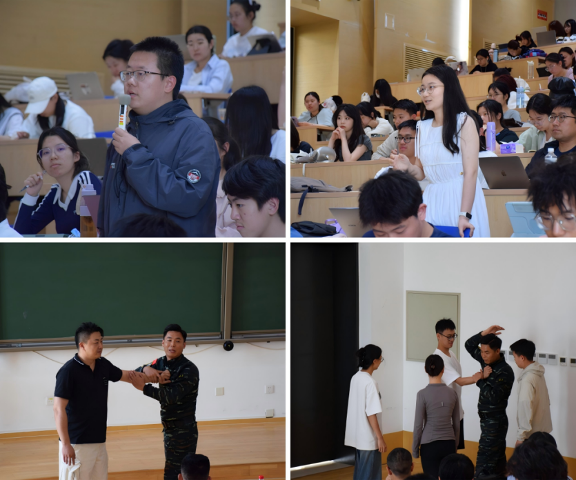 在互动环节中,陈延峰现场教学简易正当防卫技巧,邀请同学互动体验,教学氛围紧张有序又不失趣味。通过一问一答、生动的讲解与实践,提升了同学们的应急防护意识和基本技能。