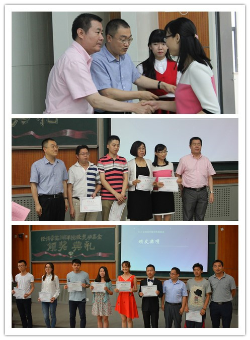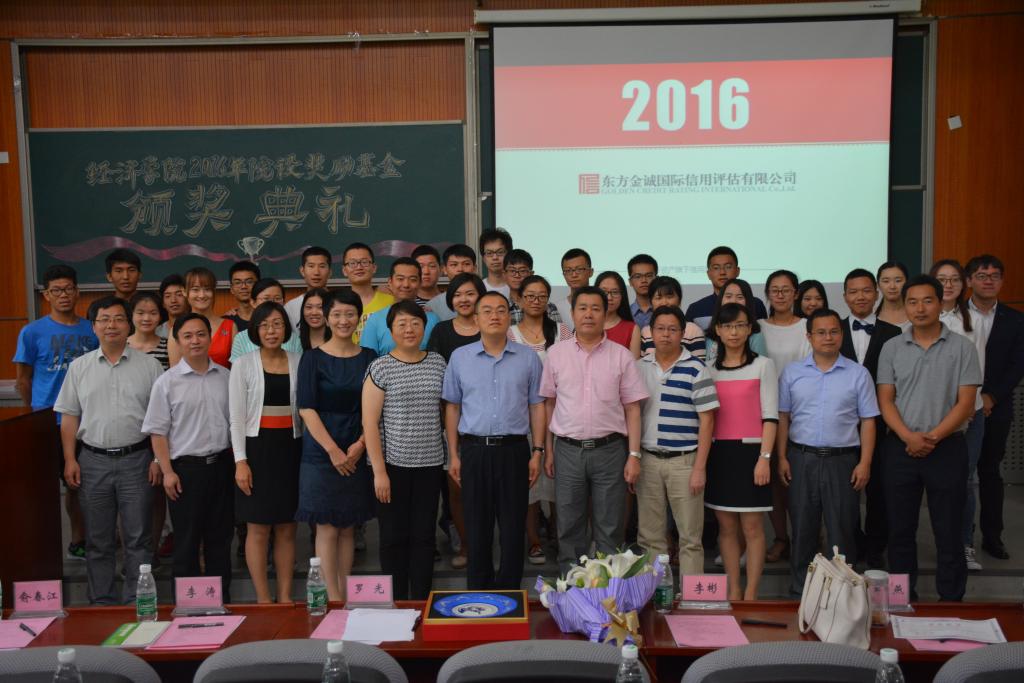 接下来,典礼进入最激动人心的颁奖环节。2016年东方金诚信用服务奖励基金共设置57个奖励名额,其中“东方金诚信用菁英教师奖”7名、“东方金诚信用奖学金”52名。由罗光董事长、李涛经理为兰日旭、韩旭明、于爱芝、邹燕等4位获奖教师代表颁奖;由李彬副经理、俞春江总监为原志听、王靖雯、方明、袁雪峥、樊妍如、徐笑森、尺列欧珠等7位获奖同学代表颁奖。