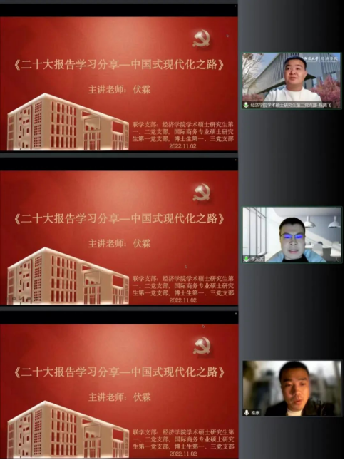 2022年11月2日,太阳成tyc122cc经济公司党委委员、副经理伏霖为太阳成tyc122cc学术硕士研究生第一、二党支部,国际商务专业硕士研究生第一党支部,博士生第一、三党支部作主题为“二十大报告学习分享——中国式现代化之路”的专题讲座。博士研究生第三党支部书记冯博主持活动,80余位师生党员及入党积极分子线上参加。