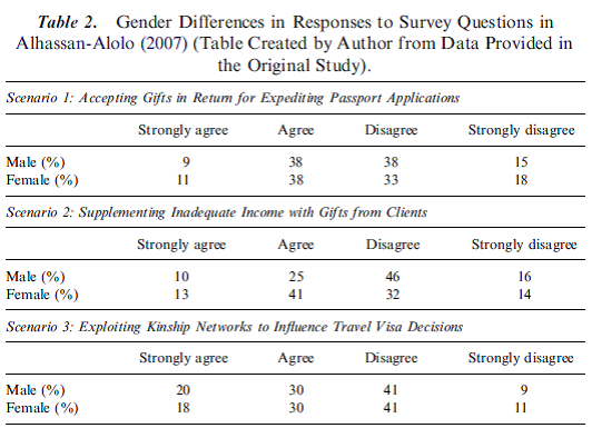 第一个场景:接受礼物的护照官员会加快委托人护照办理申请程序。第二个场景:特定政府机构的若干官员组成一个群组,接受委托人(client?)的金钱回报来弥补不充足的收入。第三个场景:外交部理事长利用手中职权影响亲戚的旅游签证。在每一种场景下,受访者要回答这些行为是否可以接受,并且从强烈同意、同意、不同意和强烈不同意中选择一个。Table2按性别分类显示结果。