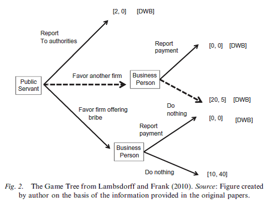 公司先选择是否给官员行贿。如果公司不行贿,那么博弈结束,博弈三方得到一系列的违约金(defaultpayments?)。如果公司决定行贿,那么他要从有界区间中决定行贿金额。公司行贿后,官员决定是否受贿。如果官员受贿,那么公司和官员的报酬增加贿赂金额的三倍,而公民报酬减少贿赂金额的7倍。所以,公民有权利选择惩罚腐败双方。但是这个惩罚是有代价的,如果公民花P惩罚腐败行为,那么他的报酬会减少P,腐败双方的报酬会减少3P。子博弈的完美均衡,一个报酬最大化的公民会选择不惩罚。正因如此,公司行贿,官员受贿。另外,公司会选择最高金额的贿赂,因为这会最大化他自身的报酬。