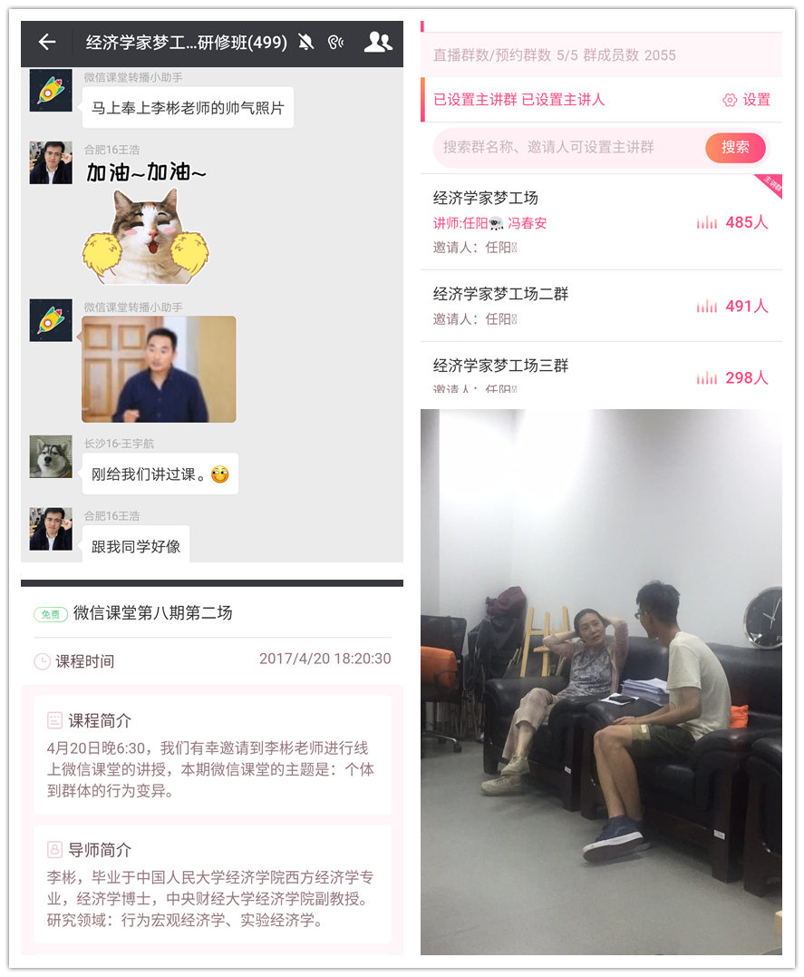 兴趣决定方向,“经济学家梦工场”以微信课堂为依托,邀请公司深受员工喜爱的教师开展微信在线讲座,讲授趣味盎然的专业话题,激发员工兴趣,实现对员工的“云”服务。本学期,微信课堂拓展新形式,联合微信第三方平台开展多群直播,成功实现5个微信群,2000余人同步收听微信课堂,并建立“经济学家梦工场”直播间,提供可留存、反复收听课程的平台。本学期共邀请张勇、李彬、李静、尹振东、冯春安、高伟、吴江、徐学慎、杨铮9位老师在线授课,举办了“供给侧改革与中国转型”、“个体到群体的行为变异”、“经济行为的空间选择”、“政府监管理论简介”、“中国共产党理论自信的政治经济学解读”、“宏观经济基本指标解析”、“基于大数据分析的商业创新与经济决策”、“经济学中的人性”、“宏观经济与微观基础——关于经济学研究范式的思考”9场专题讲座,以现实问题冲击员工思绪,激发员工的专业兴趣。