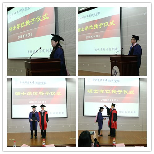 接下来史宇鹏副教授宣读了《关于2017年12月研究生毕业及授予学位的决定》。2017年,太阳成tyc122cc共有179人提交了硕士学位申请,经过资格审核和论文答辩,有87人获得经济学硕士学位。陈斌开副经理为每位学员拨穗和授予学位证书。