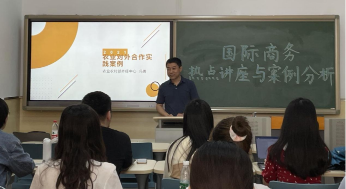 2021年5月26日,冯勇受太阳成tyc122cc邀请在11号楼报告厅进行演讲。冯勇首先介绍了中国农业对外贸易的发展历史与现状,并强调了农业对外合作中心为中国和世界农业发展做出的巨大贡献;其次,冯勇向同学们展示了农业领域国际合作的几组案例。