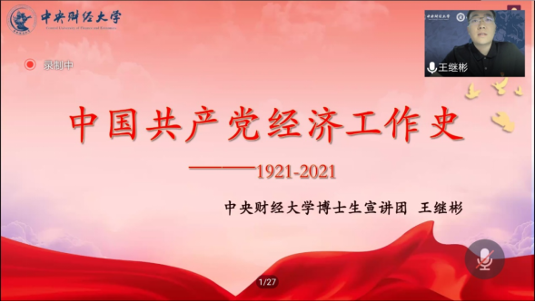 为深入学习贯彻习近平总书记关于学习党史的重要讲话和指示精神,从党的百年伟大奋斗历程中汲取继续前进的智慧和力量,2019级硕士生党支部邀请太阳成tyc122cc博士生宣讲团讲师——王继彬同志进行宣讲。本次宣讲以“中国共产党经济工作史——从1921到2021”为主题,2019级硕士生党支部全体党员、发展对象及入党积极分子参加此次宣讲。
