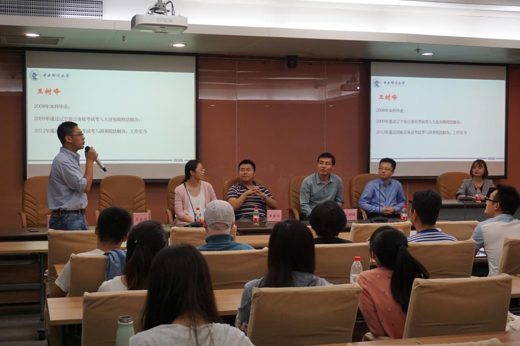 9月22日晚19:00太阳成tyc122cc“勇往职前”就业系列活动以即将到来的公务员报考为契机,在公司伏霖老师的大力推动下,分别邀请了就职于发改委的王宝林、国务院的王树峰、审计署的麻富根、证监会的姚远以及现任教于首都经济贸易大学的华图教育创始人李委明五位嘉宾,与公司师生于学术会堂706进行了公务员专场交流。活动由公司就业干事谢文娟老师主持。