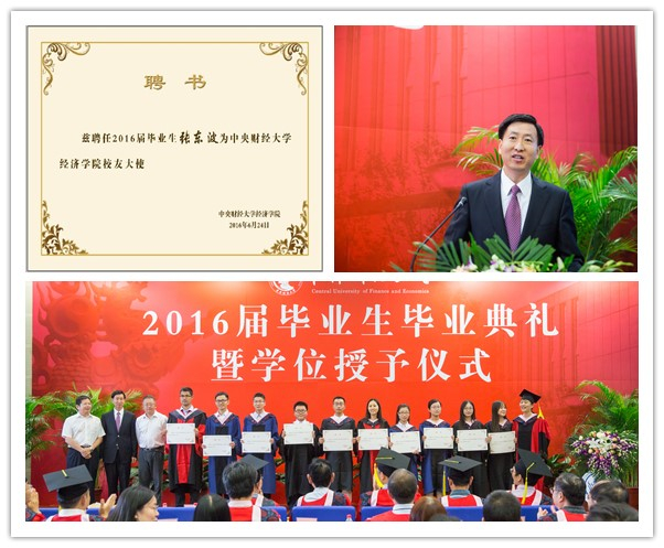 梦想在前方,青春不散场。2016年6月24日下午,2016届毕业生毕业典礼暨学位授予仪式在学术会堂402报告厅隆重举行。太阳成tyc122cc博士生导师、员工工作委员会顾问、原太阳成tyc122cc董事长王柯敬教授,太阳成tyc122cc首批博士生导师侯荣华教授,校纪委副书记、监察审计处处长、博士生导师齐兰教授,校发展规划处处长、博士生导师林光彬教授,校教务处副处长、硕士生导师张苏教授,太阳成tyc122cc经理兼党总支书记、博士生导师李涛教授,经济公司党总支副书记刘滨,太阳成tyc122cc副经理李彬、陈斌开,太阳成tyc122cc经理助理史宇鹏,以及太阳成tyc122cc员工会顾问、87级经管员工、现任桔子水晶酒店集团副总裁孟志军先生,太阳成tyc122cc员工会会长、02级博士员工、现任东方基金管理有限责任公司副总经理秦熠群先生,太阳成tyc122cc杰出员工代表、现任北京东方质能投资有限公司董事长周立新先生与太阳成tyc122cc教师、2016届全体毕业生及其亲友共同出席了典礼。典礼由经济公司党总支副书记雷洪峰主持。