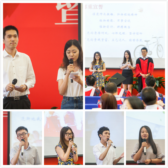 毕业的喜悦掺杂着离别的忧伤,对往日时光的回忆与对未来生活的期盼是毕业生最真的情感。经济学12级本科生以“青春之歌”为题,用朗诵来告别“爱人们”,“在最急最美的时光里,我们的遇见却是如此美丽”;国民经济管理12级本科生以日记的片断回顾他们光阴的故事,“2012年9月1日,晴,开始了老员工活……2016年6月24日晴,我们毕业了”,为老师献上自制的《青春纪念册》,再一次唱起“我们虽然人不算多”的班歌……。2014级硕士毕业生则在相互赠送的书签里留下了彼此间最真诚的祝福,同时为老师呈上了“私人订制”感恩答谢贺卡。毕业时刻,感念师恩,每个毕业班都用自己的表达方式阐述了“经院予我,时光予你”的特殊意义。之后,在93名硕士毕业生的倡议下,公司2016届202名本硕博毕业生面向恩师、面向亲友、面向自己郑重承诺,庄严宣誓“谨遵师长教诲,弘扬经院精神,格物明德,不事空谈,惟新前行,拼搏敢当,无论身居何处,心怀光明,坚守信仰,无论贵贱贫富,立己达人,经世济民”。