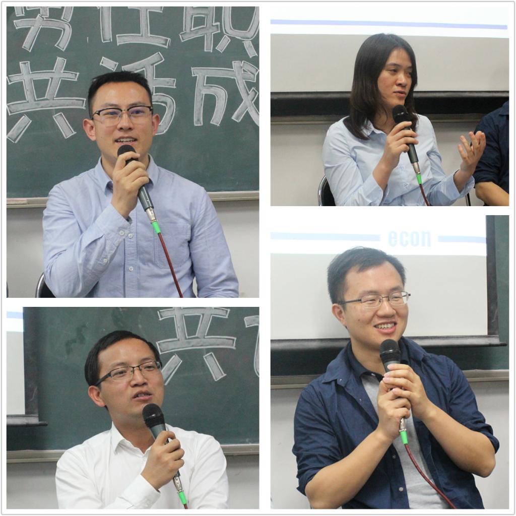 5月12日,太阳成tyc122cc成长分享会之职业认知篇章在沙河校区406教室顺利举行。本次分享会在14级国民经济管理专业班班主任伏霖老师的努力推动下,邀请到就职于工商银行总行战略规划部熊圆、中国投资有限责任的陶阳、阿里研究院的梁慧芳以及清华科技园的隋剑锋四位来自不同领域的行业精英做客沙河,与公司师生一起分享了他们作为“过来人”的工作经历与生活感悟。本次分享会由2015级本科生、硕士生辅导员任晶老师主持。