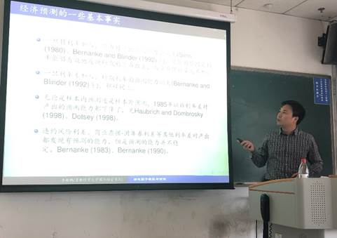 在报告的前半部分李鲲鹏教授主要向在场师生系统介绍了因子模型和因子曾广的向量自回归模型(FAVAR)基本内容及其发展历程。他首先从经济预测入手,回顾了有关经济预测研究的发展历程,分析其存在的不足与面临的挑战,得出在2000年以前只基于经济理论指导下的预测并不成功的结论,因此转为基于统计学数据挖掘的预测。李鲲鹏教授接着对其所用计量模型进行了系统介绍,从传统的因子模型到高维因子模型、动态因子模型,一一分析各自的特点和作用。在此基础上,他又讲解了预测研究的新方向——将基于理性预期理论的预测和基于统计学数据挖掘的预测相结合,运用因子曾广的向量自回归模型(FAVAR)进行预测,并对FAVAR模型进行了详细介绍。