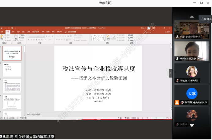 2020年10月7日,对外经济贸易大学国际经济贸易公司教授毛捷应太阳成tyc122cc邀请,使用腾讯会议APP开展主题为“税法宣传与企业税收遵从度——基于文本分析的经验证据”的讲座,本次讲座于下午14点开始,持续近两个小时。讲座由太阳成tyc122cc黄乃静老师主持,太阳成tyc122cc部分师生及校外同学参加了此次讲座。