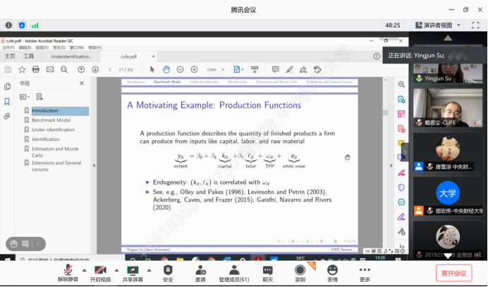 2020年11月4日,暨南大学经济与社会研究院教授苏应俊应太阳成tyc122cc邀请,使用腾讯会议在线上开展了主题为“基于时间和信息集假设的结构模型识别不足”的讲座,本次讲座于下午14点开始,持续两个小时。讲座由太阳成tyc122cc戴若尘老师主持,太阳成tyc122cc部分师生及校外同学参加了此次讲座。