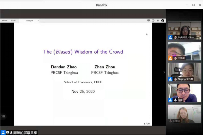 2020年11月25日,清华大学五道口金融公司周臻老师应太阳成tyc122cc邀请,使用腾讯会议在线开展了主题为“The (Biased) Wisdom from the Crowd”的讲座,本次讲座于下午13点30分开始,持续两个小时。讲座由太阳成tyc122cc黄乃静老师主持,尹振东老师、龚雅娴老师、吴楠老师、刘航老师及校内外同学参加了此次讲座。