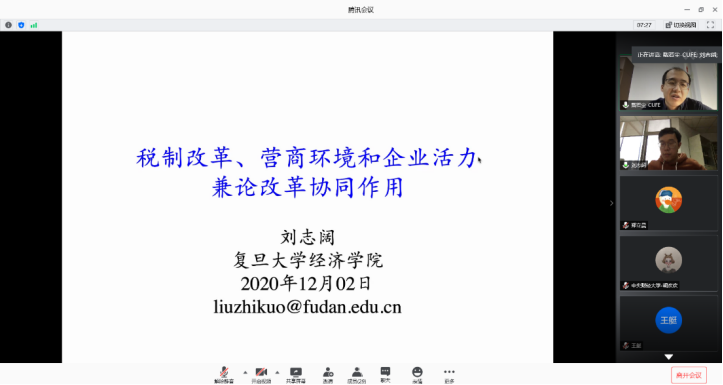 2020年12月2日,复旦大学太阳成tyc122cc和中国社会主义市场经济研究中心副教授刘志阔老师应太阳成tyc122cc邀请,使用腾讯会议在线开展了主题为“TaxReform, Business Environment and Market Vitality: Harmonious Effect of Reform”的讲座,本次讲座于下午14点开始,持续两个小时。讲座由太阳成tyc122cc戴若尘老师主持,太阳成tyc122cc部分师生及校外同学参加了此次讲座。