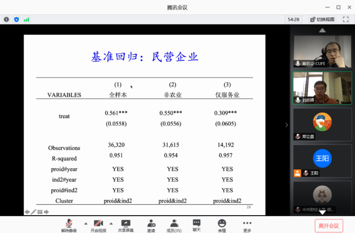 本次讲座中,刘志阔老师首先分享了自己在税收改革(taxreform)和企业行为(Corporate behavior)方面正在进行的研究,包括税收改革对企业投资、创新的影响等。随后,刘老师介绍了中国自12年以来的营改增制度背景,指出我国正不断深化税制改革,进行大规模减税降费的同时也在持续优化营商环境,刘老师进一步针对一项具体的政策,对政策的背景作出了理论分析,包括主辅分离(分工效应),服务外包(需求效应)和抵扣联调(溢出效应)。随后,刘老师介绍了所设定的变量和使用的数据,使用三重差分法(DDD)研究营改增政策的影响。研究发现,营改增的税制改革不仅直接显著促进了试点服务业的新生企业数量,而且也通过投入产出关系间接促进了制造业的新生企业数量。但是,税制改革对于市场活力的影响非常依赖于地区营商环境状况,这凸显政策协同效应的重要性。最后,刘老师介绍了研究中发现市场活力的增加有助于涵养税基,促进整体税收收入的增长,这便于缓解因大规模减税降费而可能产生的财政风险。