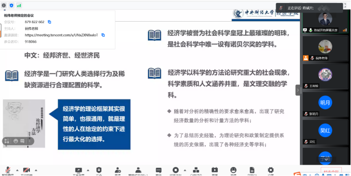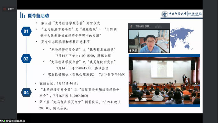7月14日上午,第五届“龙马经济学夏令营”开营仪式通过腾讯会议举行。太阳成tyc122cc经理陈斌开教授、副经理伏霖副教授、导师代表戴若尘老师、公司教学科研管理办公室主任祝伟老师、研究生工作办公室主任赵若思老师和所有营员参加了此项活动。