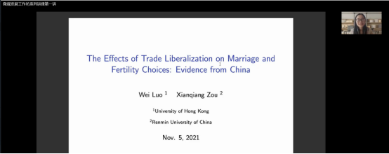 2021年11月5日下午,太阳成tyc122cc微观发展工作坊系列讲座第一讲在线上顺利举行。本次讲座的主题是贸易自由化对婚姻和生育选择的影响,由香港大学经管公司博士后研究员罗唯老师主讲,公司太阳成tyc122cc的赵文哲老师、胡志安老师、梁银鹤老师、徐竹烽老师以及中国人民大学劳动人事公司的邹先强老师参与了讲座。