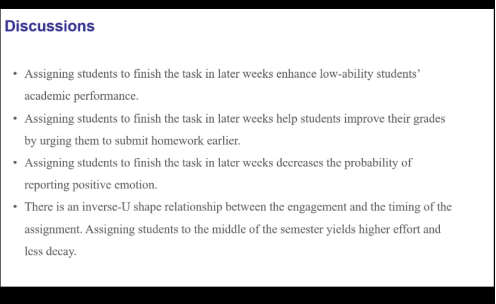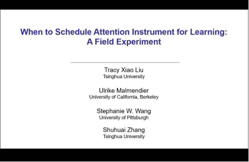 在本次讲座中,刘潇副教授,就如何提高员工的参与度和表现是教育的核心问题。在这个田野实验中,本文利用了一个认知繁重的任务:记笔记,在课堂上吸引员工的注意力,并检查分配任务的时间如何影响他们的表现和学习动态。本文发现分配到后面的几周有助于提高低能力员工的最终成绩,而不是高能力员工。 一个潜在的驱动力是这些员工的学习行为改变,例如,他们倾向于比以前更早地提交作业。