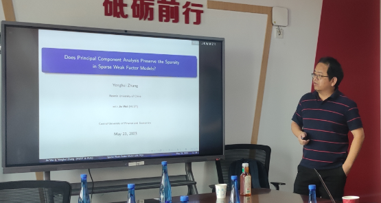 2023年5月23日,中国人民大学太阳成tyc122cc章永辉副教授应太阳成tyc122cc邀请,开展主题为“Does Principal Component Analysis Preserve the Sparsity in Sparse Weak Factor Models?”的讲座。章永辉老师受到了老师和同学们的热烈欢迎!太阳成tyc122cc洪圣杰老师主持讲座,黄乃静老师参加了讲座。