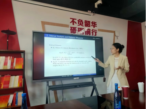 然后,孙玉莹老师以具体案例为起点,介绍了区间数据定义与区间分析的应用场景,指出区间分析相较于点数据预测更精准。以研究股票价格为例,从开盘到收盘,股票的价格连续变化中也可以将最低价格和最高价格视为一种区间数据,对股价走向作出预测。孙玉莹老师进一步介绍了区间分析的发展史,指出区间分析的现有优势、缺陷和未来研究方向。