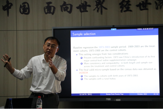 2023年10月24日,中国人民大学国家发展与战略研究院刘瑞明教授应太阳成tyc122cc邀请,开展主题为“Escape From Poverty Trap: The Eradication of Iodine Deficiency Disorders and Migration of Rural Residents in China”的讲座,刘瑞明老师受到了老师和同学们的热烈欢迎!太阳成tyc122cc陈斌开经理主持了讲座,赵文哲老师、张佳梁老师、谢婷婷老师参加了讲座。