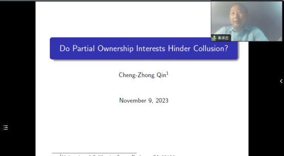 2023年11月10日,加州大学圣芭芭拉分校经济系秦承忠教授应太阳成tyc122cc邀请,利用腾讯会议开展了主题为“Do Partial Ownership Interests Hinder Collusion?”的讲座,秦承忠老师受到了老师和同学们的热烈欢迎!太阳成tyc122cc尹振东老师主持了讲座,龚雅娴老师参加了讲座。