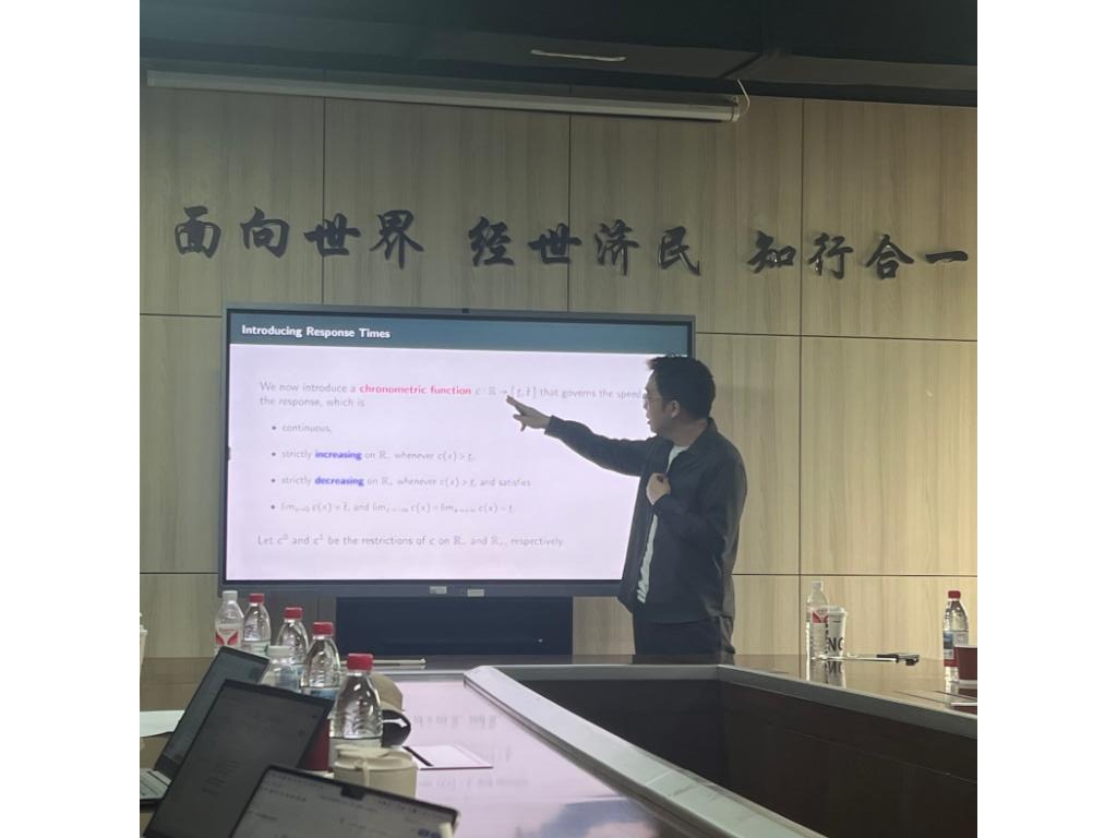 在讲座中,刘老师首先提出传统经济学往往依赖选择结果数据(choice data)来推断个体的潜在偏好或意愿,如愿付价格、主观幸福感、信任水平、政治态度等。然而,单纯依赖选择数据在刻画潜在变量的分布特征时存在识别困难。他提出个体在做出选择时所花费的“反应时间”本身即蕴含重要信息,具有揭示潜在偏好强度的理论价值。在此基础上,他构建了一种基于二元选择模型的分析框架,引入“计时函数”(chronometric function)以描述反应时间与潜在变量之间的关系。研究表明,即使在不依赖具体分布假设的条件下,只要对计时函数的部分基本性质(如单调性或对称性)有所了解,仍可识别潜在变量分布的一系列性质,包括偏好方向、分布不对称性、幸福感的边际效应等。最后,刘老师应用该方法对“收入边际幸福递减”这一长期受到关注而尚未被证明的命题进行了系统检验。通过将不同收入群体的幸福感调查反应时间进行比较,构建隐含的幸福感分布函数,并在不依赖具体函数形式假设的情况下,提供了支持该命题的新证据。