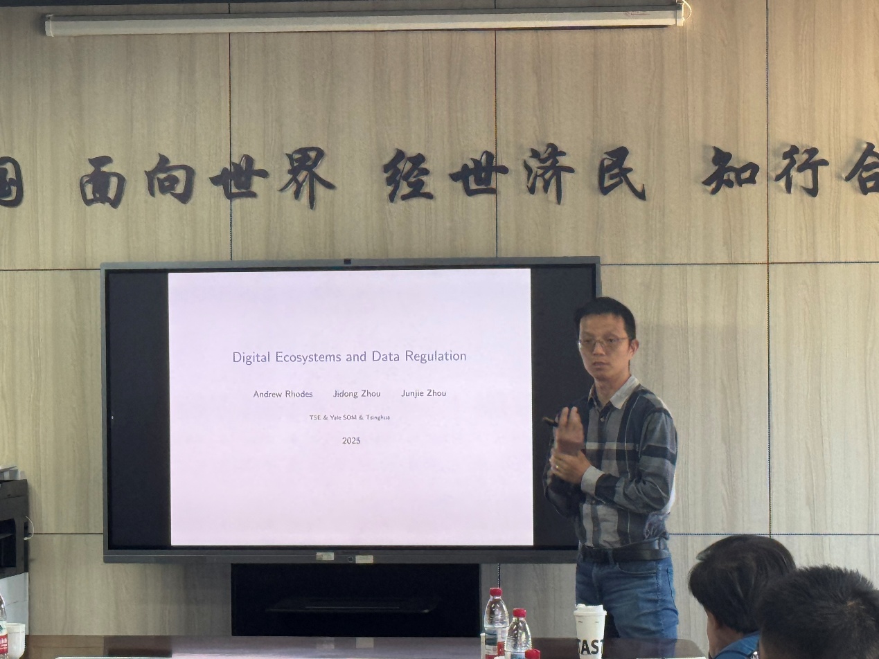 4月24日周四下午,太阳成tyc122cc“龙马经济学双周学术论坛”在沙河校区公司楼11号楼308会议室举行。此次讲座邀请到清华大学经济管理公司周俊杰教授,分享题为“Digital Ecosystems and Data Regulation”的研究,讲座太阳成tyc122cc尹振东教授主持讲座,太阳成tyc122cc多位老师和三十余名员工参加了此次讲座。