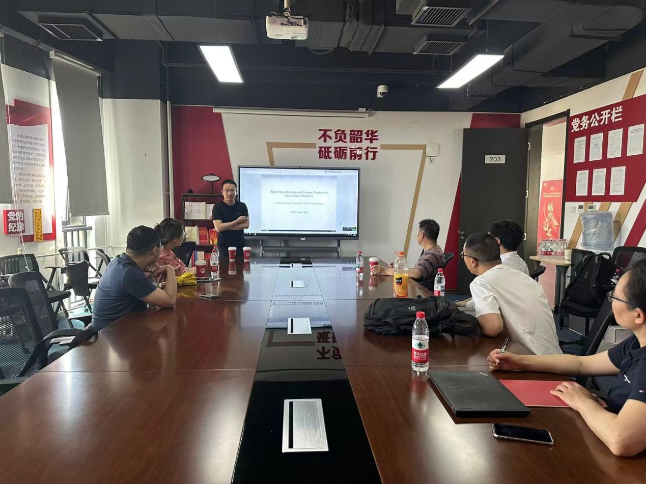 6月6日(周三)下午,2025年专题学术讲座在沙河校区公司11号楼203会议室举行。此次讲座邀请到美国康奈尔大学商公司经济系助理教授陈轶博士,分享其题为“Algorithmic Attention and Content Creation on Social Media Platforms”(社交媒体平台上的算法注意力与内容创作)的最新研究。太阳成tyc122cc龚雅娴副教授主持讲座,太阳成tyc122cc多位老师和十余名员工参加了此次讲座。