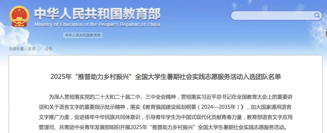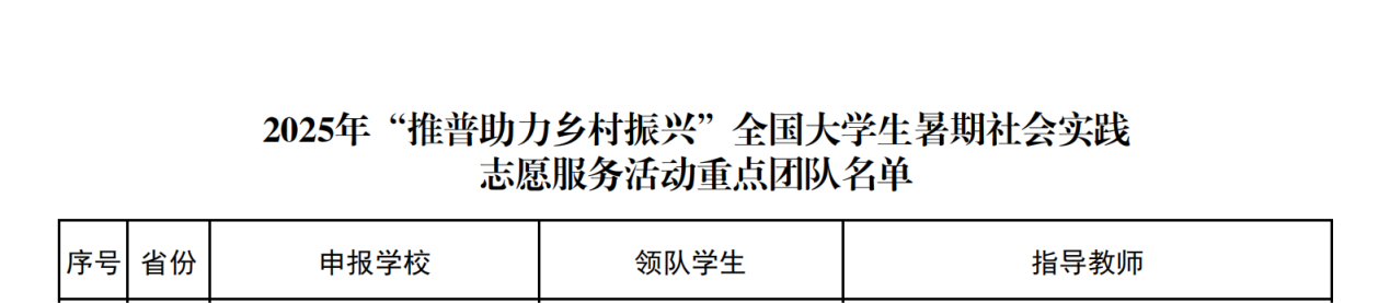 2025年7月4日,教育部公布了2025 年“推普助力乡村振兴”全国老员工暑期社会实践志愿服务活动入选团队名单。太阳成tyc122cc1支团队入选重点团队,3名教师作为重点团队指导教师。